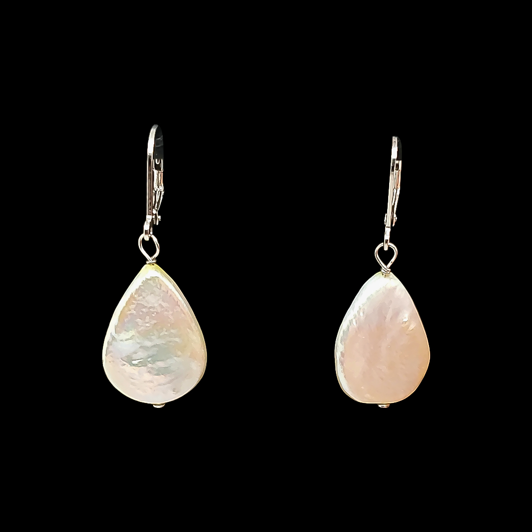FANCY SHAPE WHITE COIN PEARL EARRINGS 21MM X 14MM APPROX PEARL SIZE 1″ APPROX LENGTH SS WITH RHODIUM PLATING PEACHY PINK LEVER BACK